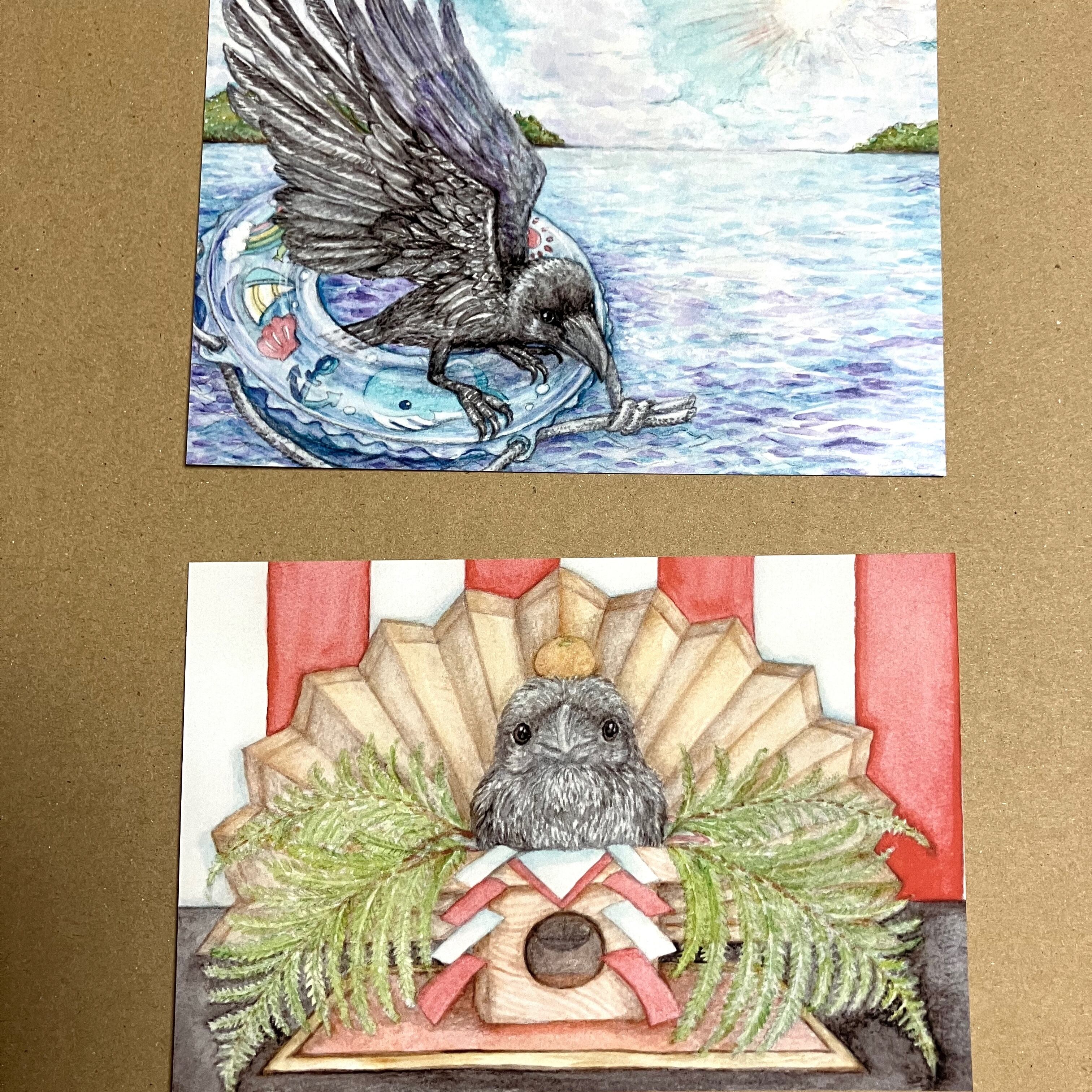 4枚セットです。透明水彩の優しいタッチとカラスのハッピーの可愛さが魅力のイラストポストカードとなっております。